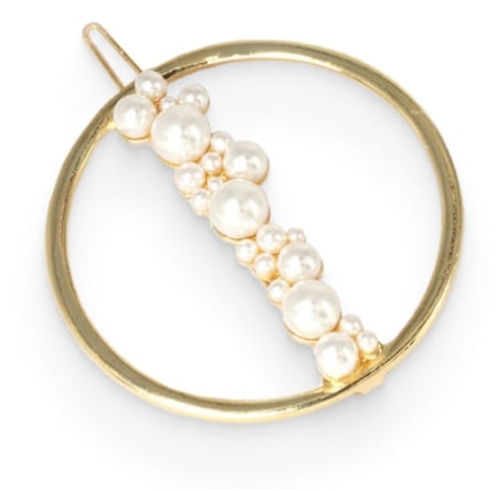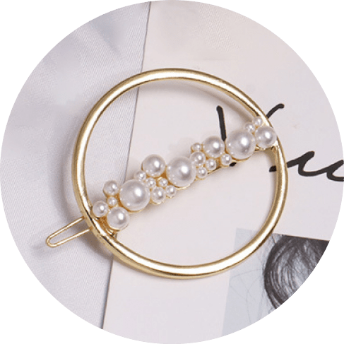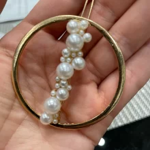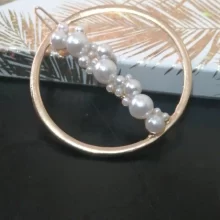 This stunning Faux Pearl Hair Clip has a lovely golden tone and is decorated with faux pearls. Size: 2.6 in.*2.6 in. Weight: 0.5 oz.