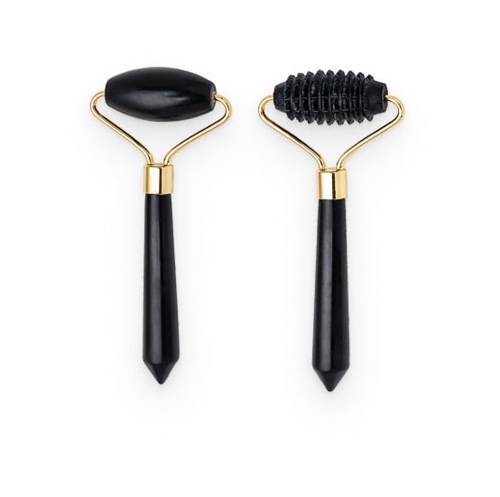The set includes two obsidian facial rollers. The smooth roller reduces puffiness and inflammation, while the spiked one stimulates the lymphatic system by setting stagnant blood into movement.